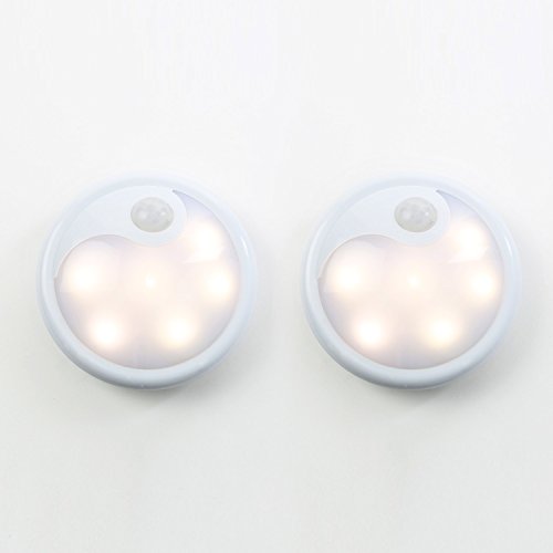 - Set of 2 Motion Activated LED Lights with 6 Warm White LEDs per light; 4.5″ in diameter